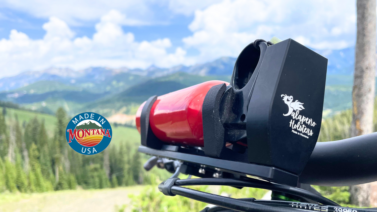 Other features include a trigger guard that adds extra protection against an accidental spray from taking a spill on the trail. And fully adjustable design allows the user to attach the mount to the center of the handlebars for even weight distribution. The mount can also be adjusted for a right or left hand person to draw the bear spray with their dominant hand.